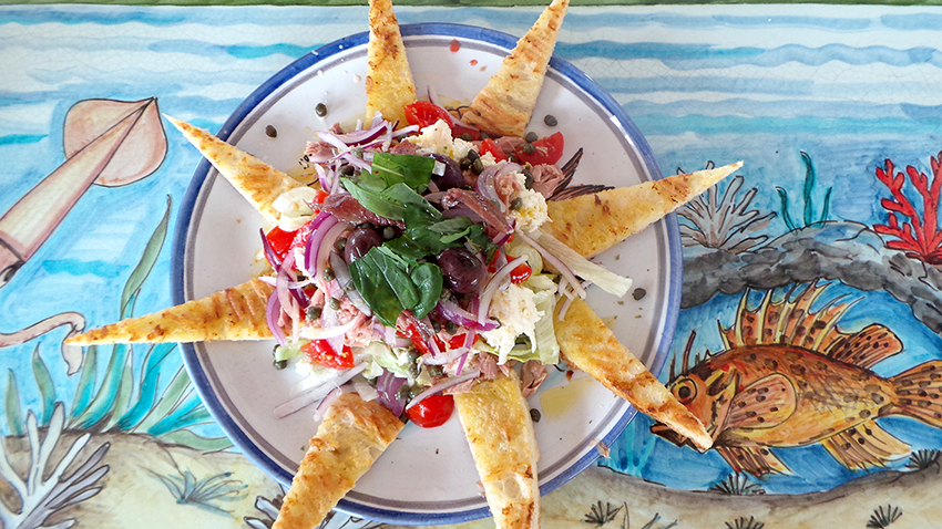 piatto con filetti di tonno sott‘olio lavorati a mano, pomodorini, cucunci di Lipari e avocado