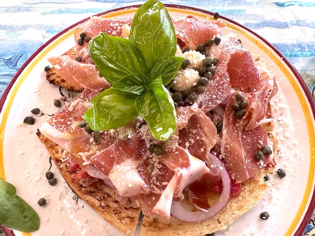 bread (semolina flour), piccadilly tomato, tuna fillets, Parma ham, parmesan (milk), onion, capers, champignon, extra virgin olive oil, salt, oregano, fresh basil